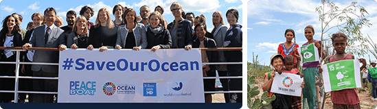 Peace Boat is a committed campaigner for the United Nations’ Sustainable Development Goals, or SDGs. Also known as the “Global Goals”, the SDGs are a call to action to protect the planet and end poverty. We sail with the SDG logo on our ship, and our programs onboard and in port engage people to take action for the goals.